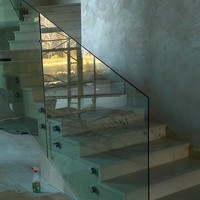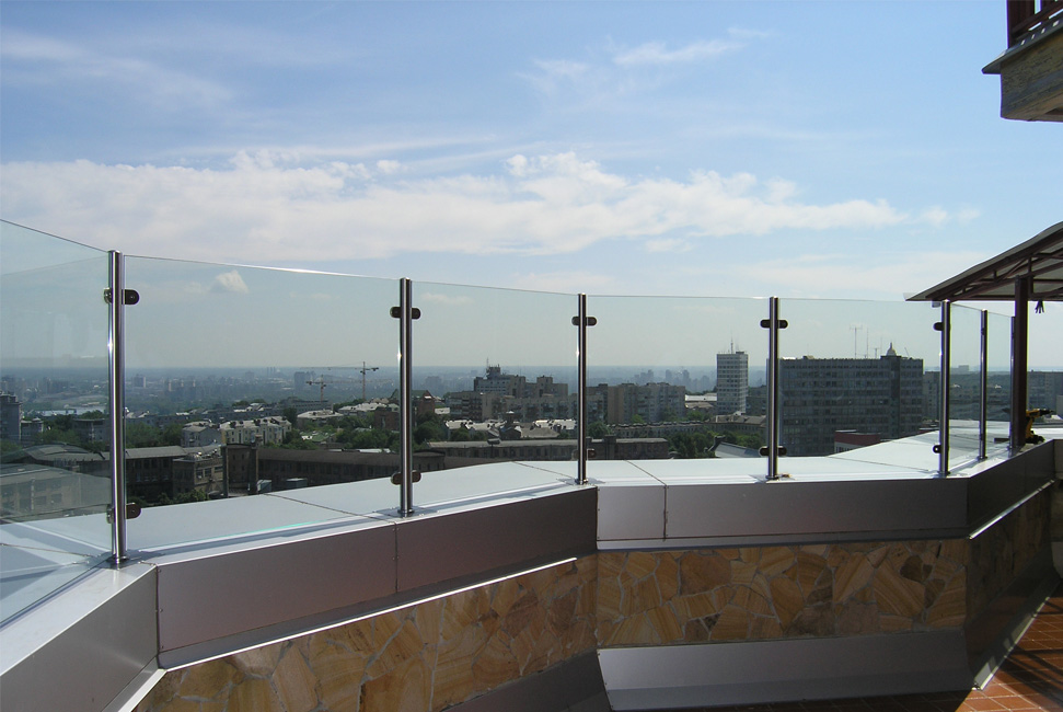 Выглядят лёгкими и невесомыми, они отлично вписываются в дизайн помещений, в котором преобладают стеклянные конструкции. Используется закаленное, либо сырое стекло 10-12 мм, склеенное между собой полимерной пленкой — триплекс.